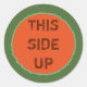 Texto "Este lado para cima" no círculo laranja, sobre fundo verde escuro. Sempre que as coisas podem virar de cabeça para baixo. Movendo-se ou apenas para uso prático em seu armazenamento. A cor verde escura pode ser personalizada.