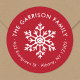 Barato impresso com etiquetas de endereço redondo impresso personalizadas com o nome da sua família e o endereço de retorno. Este simples design de Natal moderno apresenta um floco de neve branco sobre um fundo vermelho festivo. Use as ferramentas de design para escolher qualquer cor de fundo, editar fontes de texto e cores ou carregar suas próprias fotos para design suas próprias etiquetas de endereço de retorno de feriado, selos de envelope ou adesivos de etiqueta de presente.