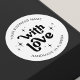 Adesivo de negócios moderno feito à mão com amor com fontes retrô groovy em preto e branco. Você pode adicionar o nome da sua empresa e criar seus próprios rótulos personalizados de embalagem para negócios. Adicione o toque final aos seus pedidos com este design de adesivo de estilo nostálgico e moderno Feito Com Amor.