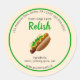 Esta etiqueta editável apresenta um fundo claro com um anel verde. No centro está uma ilustração de um cachorro-quente com relento e mostarda nele. No topo estão as informações de contato da empresa/empresa, o nome da empresa e o nome do produto. Abaixo, está a lista de ingredientes e as informações do site. Todo texto é editável, portanto, vá em frente e altere as informações, assim como o tamanho, a cor e o estilo da fonte. Você também pode alterar as cores de fundo e anel. Aproveite a sua nova etiqueta de refiabilidade editável!