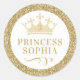 Dourado brilho com texto personalizável de nome de princesa de cor dourada e idade opcional ou inicial na coroa! Perfeito para uma festa de princesa de menina ou chá de fraldas feminino como selos de convite, etiquetas de favor ou personalizar uma folha com o nome de cada convidado para criar um favor personalizado divertido! O trabalho de arte é uma imagem impressa de brilho - não é usada nenhuma brilho real. Visite o compro Paper Grape Zazzle para coordenar artigos de partes, artigos de papelaria e convites.