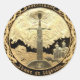 Dourada etiqueta de garrafa de vinho do castelo medieval de Camelot do Rei Arthur, e o mago Merlin atrás da Espada Excalibur dos Cavaleiros. Esta é uma bela etiqueta de Camelot que pode ser usada para rotular seus vinhos. Bonito utilizado para rótulos de vinho ou para rótulos de produtos. O Dragão está perto do perímetro. Esta é uma cópia de uma moeda francesa.