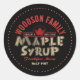 Este rótulo não é para a fraqueza do coração. Negrito, escuro e rústico, ele desenhar a imagem de um pote quente de seiva sendo fervida em um velho fogão de madeira em um galpão. O emblema da folha vermelha mostra a nota enquanto o xarope de bordo é escrito em uma fonte decorativa rústica. Edite este rótulo de xarope de mapa em negrito adicionando seu nome comercial, endereço, volume de xarope de maple e nível.