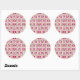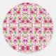 Round sticker design featuring vibrant pink flowers and green leaves on a white background. The sheet displays five identical stickers, conveying a floral, cheerful tone.