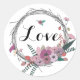 Uma bonito coroa de videira contém a palavra amor. Flores roxas, brancas, cor-de-rosa, e até morangos silvestres vermelhos pequenos decoram a coroa. Perfeito para um casamento no campo ou no celeiro.
