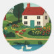 A country house with a red roof and smoking chimneys, surrounded by a blooming garden.