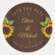 Casamento tradicional da Rússia salve o adesivo de data com belos buquês de girassol sobre um fundo de madeira marrom. ++++++ Ideal para o seu verão ou outono caia no elegante jardim ao ar livre, celeiro de fazenda ou casamentos temáticos no quintal. Personalize com os nomes da noiva e do noivo, data do casamento e lugar!