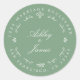 Chic, moderno e simples retorno de casamento discursam um adesivo redondo clássico com o texto o futuro Sr. e Sra. em um roteiro elegante branco sobre um fundo verde mineral embelezado com louros e outros detalhes decorativos rústicos. Basta adicionar seu nome e endereço. Desenvolvido exclusivamente para você pelo Happy Dolphin Studio. Se precisar de ajuda ou produtos correspondentes, entre em contato conosco em happydolphinstudio@outlook.com. Estamos felizes em ajudá-lo a fazer seu casamento o dia mais bonito!