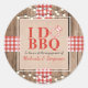Este design de estilo rústico apresenta um fundo de madeira com fita vermelha e branca. Além disso, há uma textura de burlap, com serif vermelha e preta e fontes de script manuscritas, tudo personalizável para o seu evento, seja uma festa de noivado ou chás de casais. Celebre em estilo com este design de adesivo!