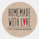Um adesivo moderno personalizado "feito com amor" num fundo branco. Faça-o seu adicionando seu próprio nome. Um bonito toque final para todos os presentes feitos à mão. Projetado para você pelo Blackberry Boulevard.