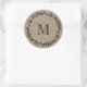 Rustic Laurel Wreath Farmhouse Style Monogramed Classic Round Sticker - um adesivo único ao estilo da fazenda. Seu monograma está cercado por uma coroa rústica de louros em um fundo de burlap. Perfeito para assuntos pessoais ou comerciais.