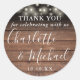 Um roteiro de assinatura rustica favorece o obrigado, seu adesivo redondo clássico, com luzes bonito de cordas e nomes de estilo de assinatura em um fundo de painéis de madeira. Personalize com seu obrigado especial suas informações em tipografia branca-chic. Projetado por Thisnotme©