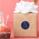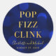 Adesivo elegante com as palavras "Pop Fizz Clink" em folha de ouro falso sobre um fundo de luzes bokeh azul safira. Perfeito para festas de noivado, casamentos, aniversários, datas de nascimento ou outros eventos.