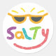 Salty design apresenta a palavra "salty" em um estilo divertido desenhado à mão com o "y" formando um sorriso abaixo. Com sombras e cabelos acima é para quando você está se sentindo salgado.