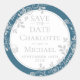 Uma elegante salvação do adesivo de data enquadrado em um lugar floral vitoriano prateado num fundo azul francês. Projetado por Thisnotme©