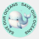 Stickers azuis com uma fotografia fofa de uma Baleia no meio. Salve os oceanos impressos em um círculo ao redor das bordas. Autocolantes ambientais e verdes. Excelente para todos os seus projetos de Papel de carta, artesanato ou escola. Coloque suas lancheiras ou garrafas d'água.
