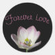 Um adesivo elegante em preto com texto rosa pálido e uma imagem de uma flor rosa solteiro florescendo. Encontre mais produtos correspondentes na coleção de casamento Floral In Love.