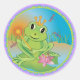 O príncipe sapo verde com coroa e varinha, é tão feliz quanto pode estar sentado no seu leito rodeado por libélulas. Projetado em cores brilhantes para crianças ou bebês.