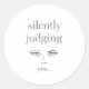 For the quiet observer in every room, this hilarious and minimalist graphic speaks volumes without saying a word. Featuring the simple, subtle text "silently judging you..." complete with a pair of judging eyes, it's the ultimate, relatable statement for introverts, people-watchers, and anyone with a dry, sarcastic sense of humor. Let your presence do the talking.
