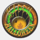Vestidos de Dia das Bruxas com lua amarela colocada contra fundo preto, que tem uma pequena bruxa voando sobre seu castelo. A cena noturna é enquadrada por um círculo laranja e verde redondo que contém as palavras "Feliz Dia das Bruxas". SOLICITAÇÕES DO CLIENTE - Email em clientrequestrw@gmail.com
