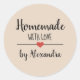 Um adesivo moderno de "homemade with love" com uma letra preta sobre um fundo bege embelezado por um coração vermelho fofo. Personalizar texto.