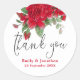 Belas rosas vermelhas profundas enfeitam a borda superior acima de uma tipografia de script do na moda set para as palavras Obrigado em preto, sob a qual você pode facilmente personalizar seus nomes e data de casamento. Perfeito para seus favores de casamento ou selos de envelopes para suas cartas de casamento.