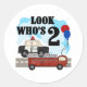 Um cruzador policial, motor de incêndio, balões e texto que diz "Olha quem é 2" está no nosso design de segundo aniversário de Heróis do Dia a Dia.