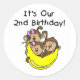 Três macacos pequenos, duas raparigas e um rapaz, e uma grande banana amarela em T-shirts de segundo aniversário Triplets, fato físico, sacos de tote, cartões, autocolantes, ímanes e muito mais.