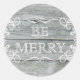 Um selo adesivo chic e na moda de Natal com fundo de cinza de madeira.As focas rústicas têm as palavras BE FELIZ com uma armação branca florescente.