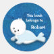 Um selo branco de bebê bonito em um adesivo azul com nome de livro brilhante. Personalize com seu próprio texto. Texto, fonte, tamanho da fonte, cor e posicionamento são completamente personalizáveis, então torne-o seu. A aparência dimensional deste adesivo é simulada no trabalho de arte.