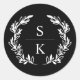 Selo de envelope de casamento preto elegante com um monograma de coroa de louro. Selo de envelope monogramado com uma coroa de louro branca contra um fundo preto. Selo de envelope preto com suas iniciais dentro de uma coroa de louro.