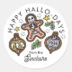 Este adesivo Happy Hallo-days é uma maneira divertida de unir o Halloween e o Natal em um design festivo. A arte combina detalhes assustadores de Halloween, como caveiras, fantasmas e um biscoito de gengibre decorado com glacê de esqueleto, com toques clássicos de Natal, como enfeites e cores de feriado. Personalize com seu nome ou o nome da família para torná-lo seu. Este adesivo redondo é perfeito para selar envelopes, adicionar um toque especial aos cartões de feriado ou usar como etiquetas de presente exclusivas durante a temporada.