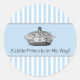 Faixas azuis e brancas com coroa de príncipe no centro e as palavras, "Um Pequeno Príncipe está a Caminho!" adesivo selo de envelope de convite de chá de bebê menino e etiqueta de lembrancinha de festa.