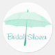 O selo bonito do envelope do chá de panela feito usando uma etiqueta da forma redonda, em um fundo branco, com gráficos de uma água-marinha coloriu o guarda-chuva e o aqua coloriu o texto que lê o chá de panela. Personalize o texto para serir suas necessidades do partido. Excelente para nupcial ou chás de fraldas.