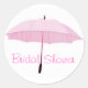 Bonito selo de envelope do chá de panela feito com um adesivo de forma redonda, em fundo branco, com gráficos de um guarda-chuva cor-de-rosa e Chá de panela de leitura de texto colorido cor-de-rosa. Personalize o texto de acordo com as necessidades do seu partido. Excelente para noivado ou chás de fraldas.