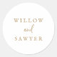 Estas selagens de envelope de casamento de guião de ouro rústico são perfeitas para um casamento no campo. O simples e moderno design de ouro e branco apresenta uma única caligrafia manuscrita branca com estilo de boho minimalista contemporâneo. Personalizável em qualquer cor. Mantenha o design mínimo e simplista, como está, ou personalize-o adicionando seus próprios gráficos e trabalhos de arte. Personalize o rótulo com os nomes da noiva e do noivo.