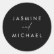 Coloque os envelopes de casamento com estas selas simples e na moda! O design apresenta seus nomes em modernas letras brancas complementadas por um roteiro manuscrito com fundo preto. Esses adesivos de casamento preto e branco são perfeitos para selar envelopes, adicionar favores de casamento, e muito mais!