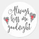 Escrita moderna em pincel, tipografia "Sempre me beije boa noite" com corações de aquarela.