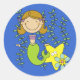 Uma sereia sorridente e uma natação amarela de estrelas-do-mar entre as algas, uma design que é fofa e colorida para meninas que amam o oceano e as sereias! T-shirts de sereia, fatos-chave, bíblias, cobertores, panos de arroto, cartões, autocolantes, bolsas, canecas, correntes-chave, travesseiros, relógios de parede e muitas outras artes de sereia!