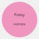 Neste dia da semana, os adesivos exibem a palavra sexta-feira junto com a tradução em inglês para espanhol, viernes. A cor de fundo é rosa, que pode ser personalizada. Obrigado por comprar CherylsArt no Zazzle.