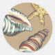 Megan Meagher é conhecida por suas simples peças de arte. Esta é uma imagem excelente da arte decorativa capturando a vida marinha com uma estrela amarela e uma concha azul e vermelha. Consiga este impressão de arte hoje na cor Khaki no seu produto Zazzle.