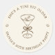 Birthday round sticker featuring a hand-drawn coffee martini glass and coffee beans paired with elegant script and serif fonts in which your personalized information is written. The background is brown stripes on a light background. Check out our store for more items from this collection.