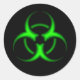 Vinheta preta com um símbolo de perigo biológico verde neon.