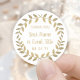 Adicione um toque final personalizado às lembrancinhas e bilhetes de agradecimento com adesivos redondos personalizados com coroa de louro. Todo o texto neste modelo é simples de personalizar para qualquer ocasião, como casamento, chá de noiva, formatura, festa de aniversário, aniversário de casamento ou aposentadoria. Altere ou exclua qualquer um dos textos para criar selos de envelope para convites, anúncios ou lembretes de data. O design botânico moderno em dourado e branco apresenta uma coroa de louro em foil falso, caligrafia rústica e tipografia clássica elegante. Por favor, note que o dourado é uma cor impressa e não foil metálico. Esses rótulos redondos elegantes adicionam um toque único e personalizado à celebração de um dia especial.