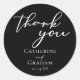 Simplesmente chique e elegante, nossa coleção de casamento de inverno minimalista apresenta uma tipografia cursiva elegante para o seu evento moderno. Impressione seus convidados com este adesivo de casamento ousado com escrita branca simples que diz Obrigado acima dos nomes dos noivos e data do casamento. O complemento perfeito para um presente de recepção sofisticada.