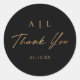 Estes adesivos de casamento simples e na moda apresentam leitura tipográfica, "Obrigado" em folha de ouro falsa sobre um fundo preto puro. Adicione suas iniciais de monograma e data de casamento para etiquetas elegantes!