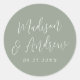 Vinhetas de casamento elegantes com seus nomes em um roteiro branco com um fundo verde sábio. Personalize os adesivos de casamento simples com sua data de casamento. Design coordena com nossa coleção de casamento Simple Script.