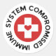 Um adesivo do sistema imunitário comprometido, branco, com um círculo vermelho no meio, com uma cruz branca e um coração vermelho.