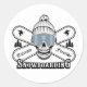This monochrome illustration featuring a skull wearing winter goggles and a knit cap, crossed with snowboard shapes. Strong contrast line art and sharp typography create an edgy alpine-inspired visual suited for winter sports enthusiasts and graphic art fans.