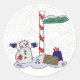 O boneco de neve está vestido com luvas e botões azuis. O boneco de neve está ao lado de um polo branco e vermelho com uma placa verde que diz "Polo Norte". Os presentes estão ao lado do polo. A neve branca está deitada no chão. Os autocolantes estão disponíveis com um fundo branco ou preto.